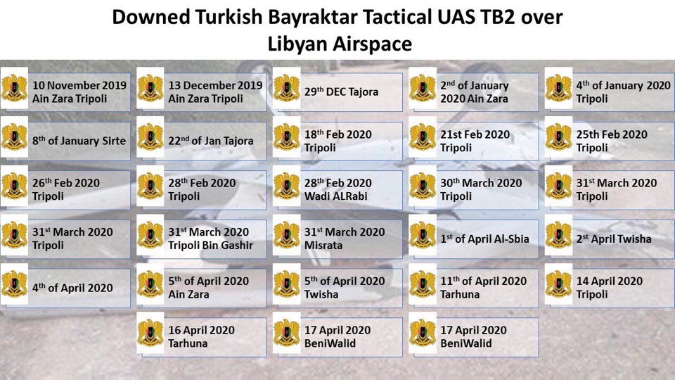 Согласно обновлённой статистике, которую предоставляет Ливийская национальная армия, в период с 10 ноября 2019 года по 17 апреля 2020 года были сбиты 28 турецких ударных БПЛА Bayraktar TB2.