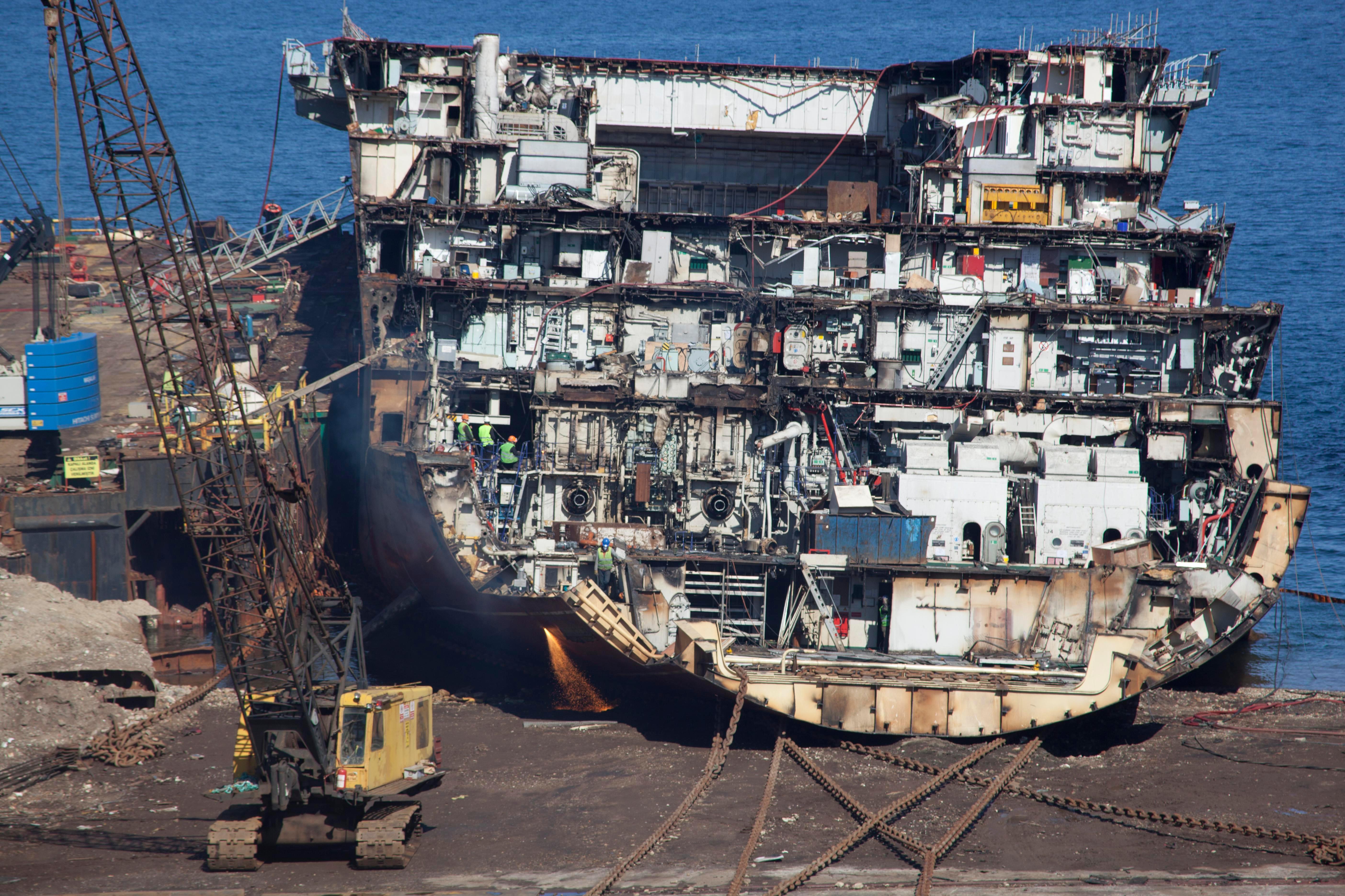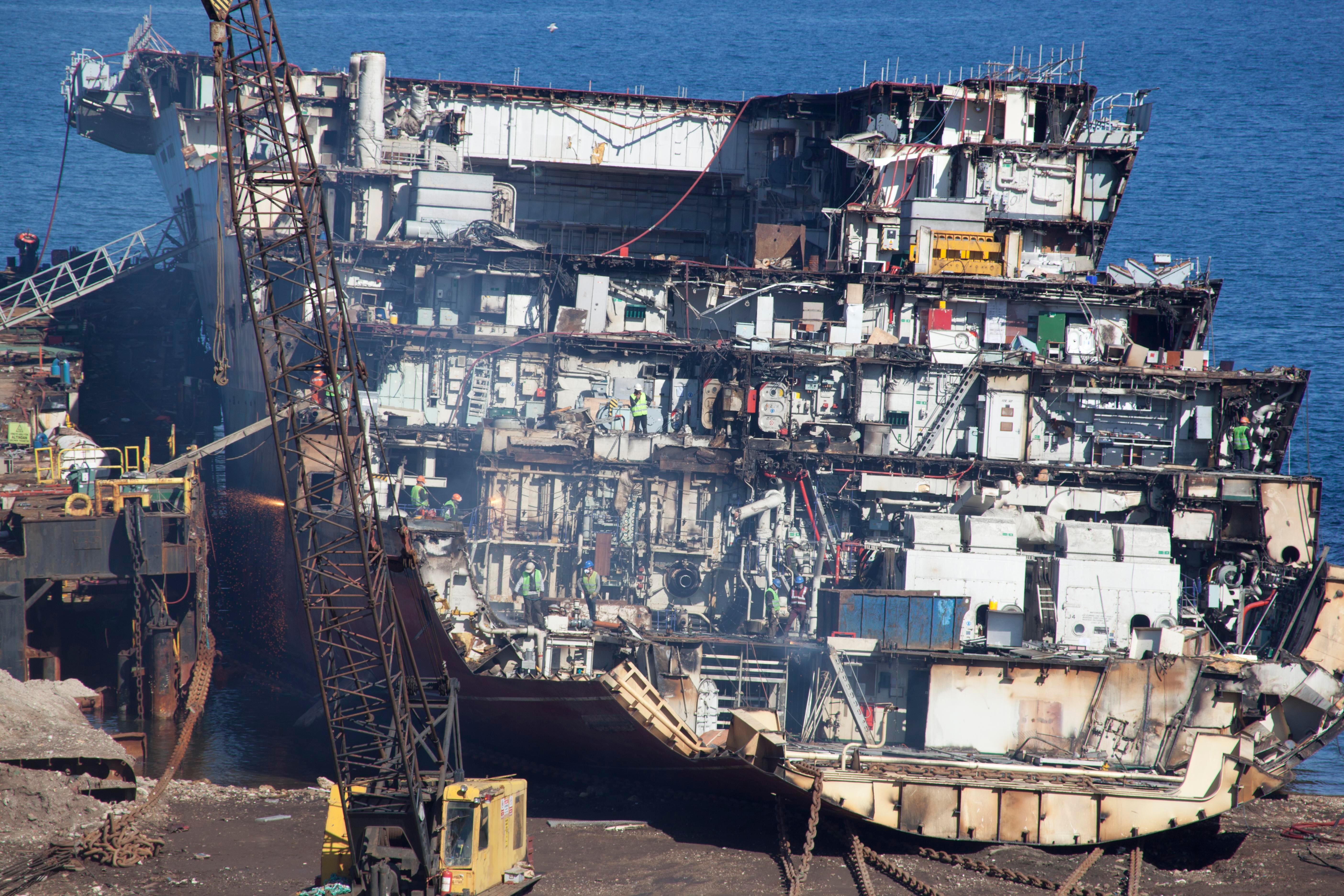 Ангар корабля имеет длину 125 м при ширине 21 м и оснащен двумя подъемниками.