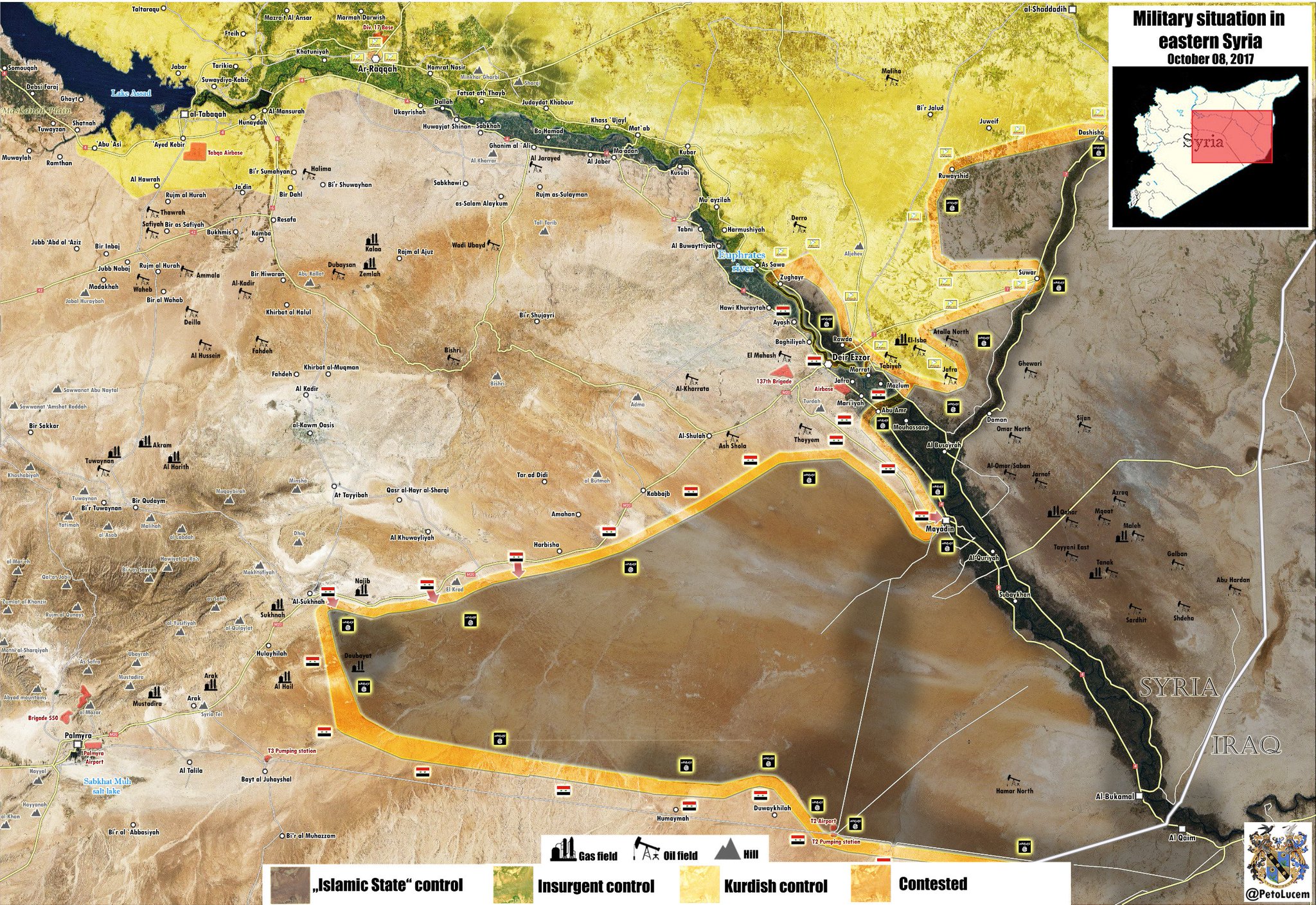 Эль-Маядин, который находится в 45 км к юго-востоку от провинциального центра Дейр-эз-Зор, служит форпостом бандформирований ИГ*. Поблизости от него проходит граница с Ираком.