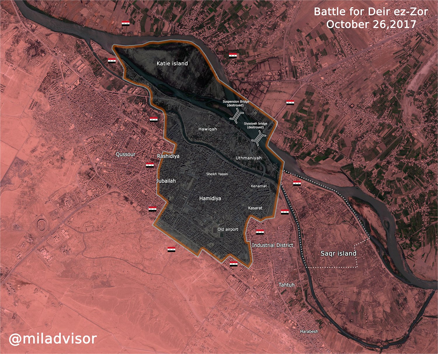 В желтый цвет перекрасилась и часть карты на восточном берегу, которая несколько дней назад была красной, в районе Маядина. САА оставила эти районы практически без сопротивления , где были попытки сопротивления, например в районе поселка Тайяни, они подавлялись авиацией коалиции, ВКС при этом были в качестве наблюдателей, никаких действий не предпринимали. Судя по всему в последний момент включили заднюю, чтобы сделать приятное " уважаемым партнерам", мост же наводили за чем-то через Евфрат.