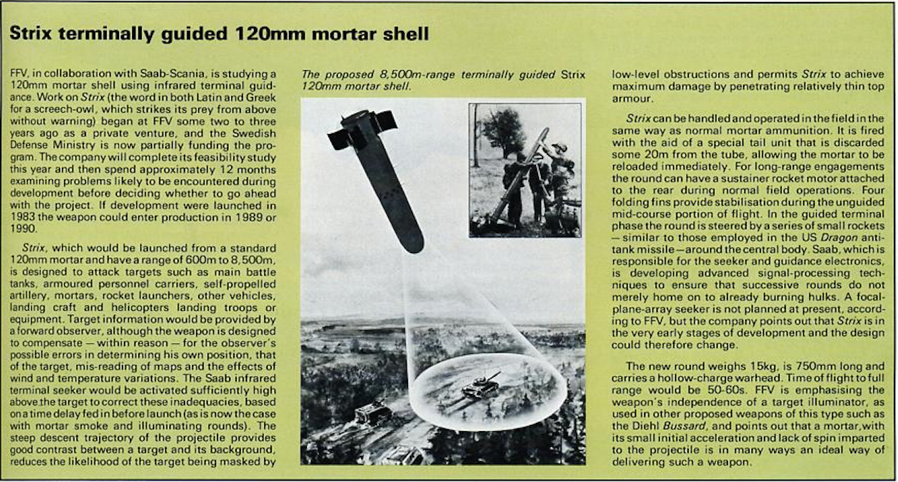Шведская 120мм самонаводящаяся мина Стрикс (Pansarsprängvinggranat m/94 STRIX), с ИК наведением и кумулятивной БЧ. Принцип действия аналогичен бриттовской мине Мерлин, только вместо РЛС стоит ИК система. Закупалась шведами и швейцарцами. Единственная из таких систем которая дошла до поставки в войска.