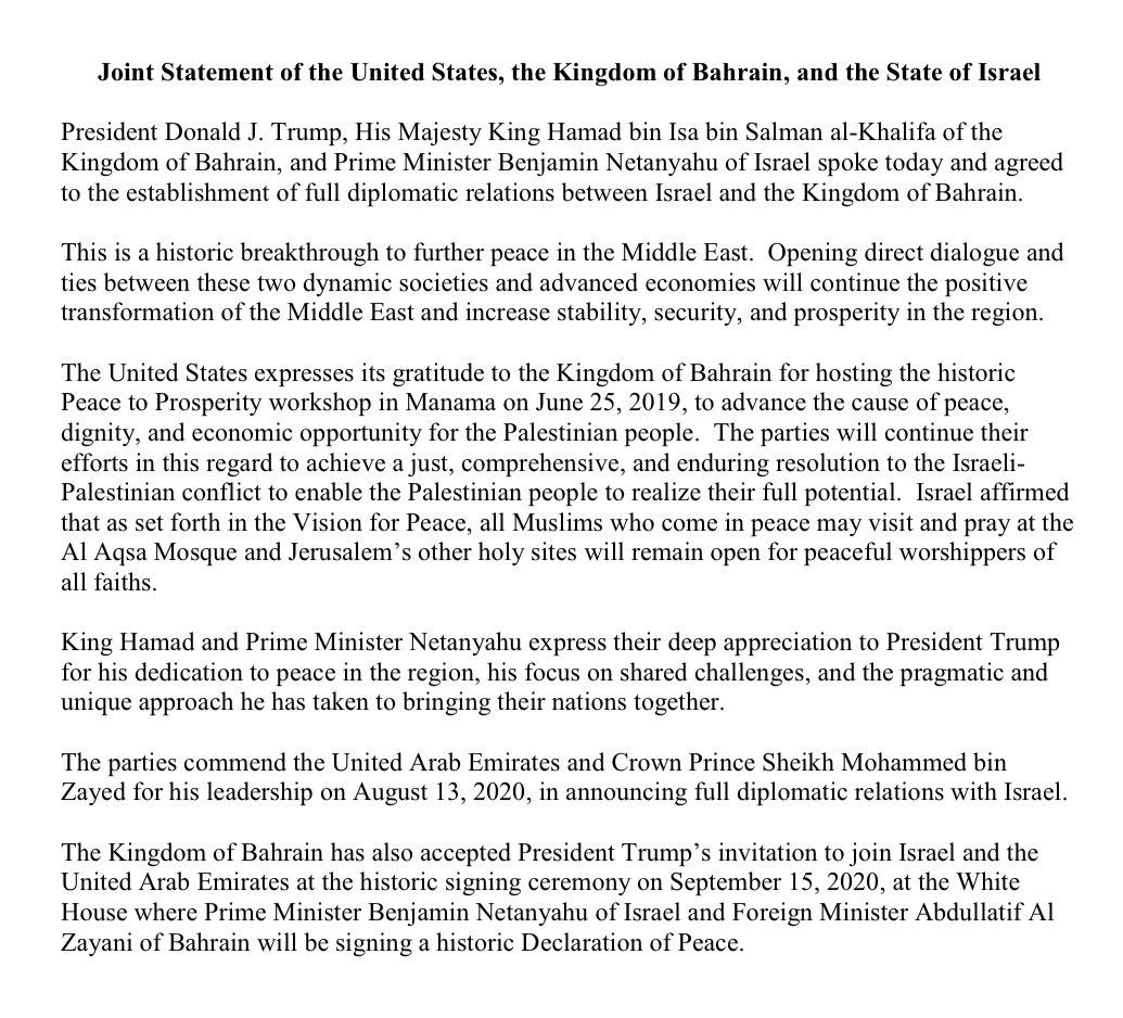 Судя по всему и Бахрейн, таки да, всем нобелевку. Трамп сказал, что арабы-палестинцы должны вернуться "в лоно", не знаю прилично ли в переводе на арабский...
