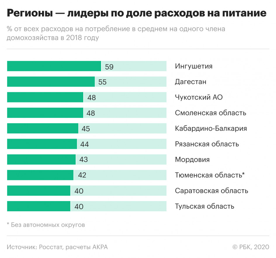 АКРА оценивает долю расходов на питание от всех расходов на потребление в среднем на одного члена домохозяйства. Расчеты основаны на данных Росстата (последние — за 2018 год).