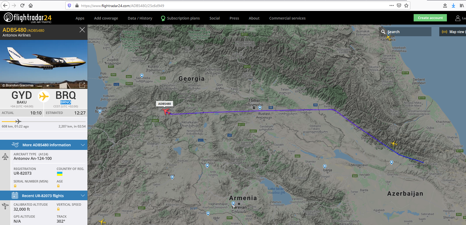 Украинский Ан-124 из Азербайджана в Чехию, в аэропорт Брно. А в Брно находится оружейный завод (гугл в помощь). Вот и чехи (НАТО) с оружием для Азербайджана подтянулись.Он в был Баку транзитом из Пакистана.