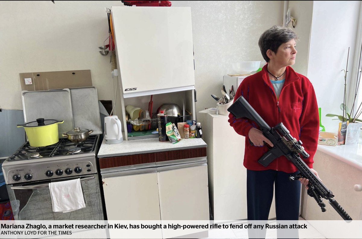 The Times: «Марьяна Жагло купила свое собственное охотничье ружье, но она собирается стрелять не в оленей. «Как мать, я не хочу, чтобы мои дети унаследовали проблемы Украины. Будет лучше, если я разберусь с этим сейчас», — сказала 52-летняя маркетолог, беря в руки карабин Zbroyar Z-15 на кухне своей киевской квартиры. «Я купила этот карабин после того, как послушала, как несколько солдат обсуждали, какую винтовку лучше купить. Если до этого дойдет, то мы будем бороться за Киев. Мы будем бороться, чтобы защитить наш город. Если начнутся боевые действия, русские придут сюда. Киев — главная цель»
