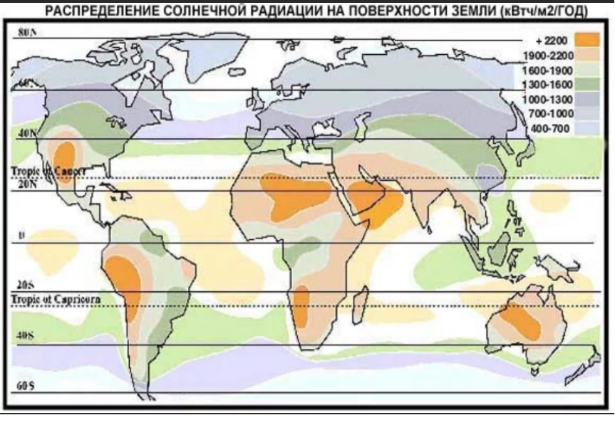 - нам то важно сколько солнечной энергии доходит до Земли, сколько проходит сквозь атмосферу-облака, сколько попадает на землю, а не в окиян, и сколько полезных площадей твердой поверхности мы сможем урвать под солнечные батареи от с/х угодий, городов-поселков-деревень, инфраструктуры - потом полученные доли % умножайте на кол-во энергии в зависимости от близости к экватору, а потом еще умножайте на КПД, учитывайте потери при передачи, и , наконец вишенка на торте, потери на аккумулировании э/э: