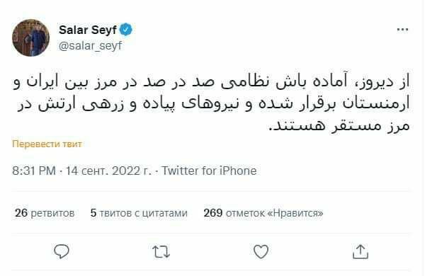 "Со вчерашнего дня на границе между Ираном и Арменией объявлена полная боевая готовность, на границе развернуты пехотные и бронетанковые подразделения армии".