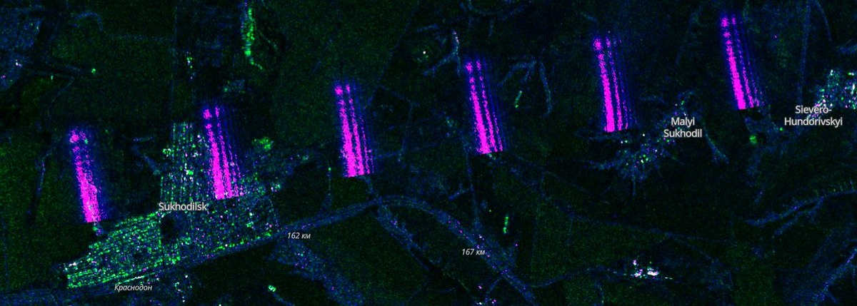 Интересные помехи обнаруженные спутником Sentinel-1 SAR над Донбассом.