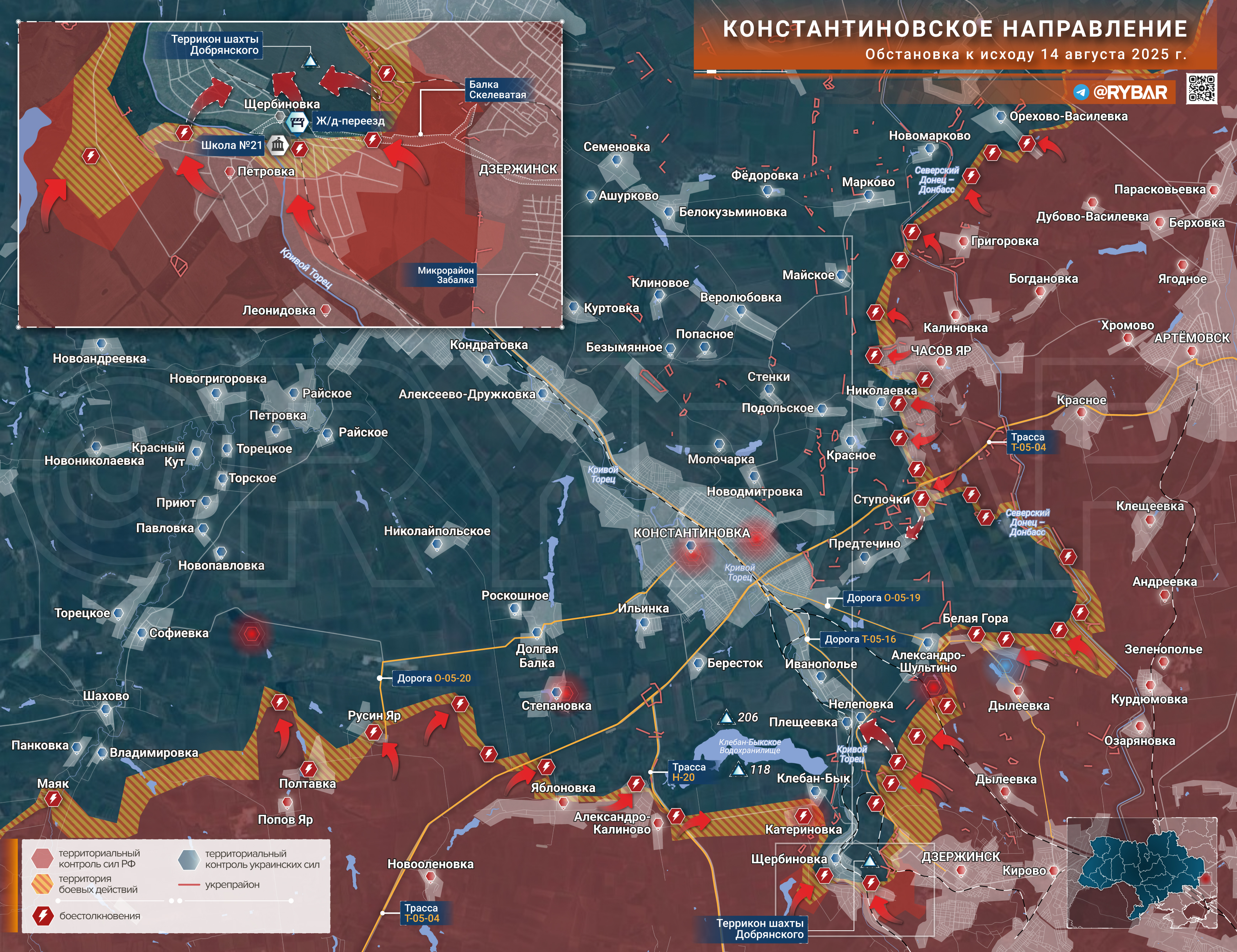 В Минобороны России объявили об освобождении Щербиновки на Константиновском направлении, в окрестностях есть успехи. Идут бои за Катериновку, противник пытается сохранить путь к силам южнее Клебан-Быкского водохранилища.