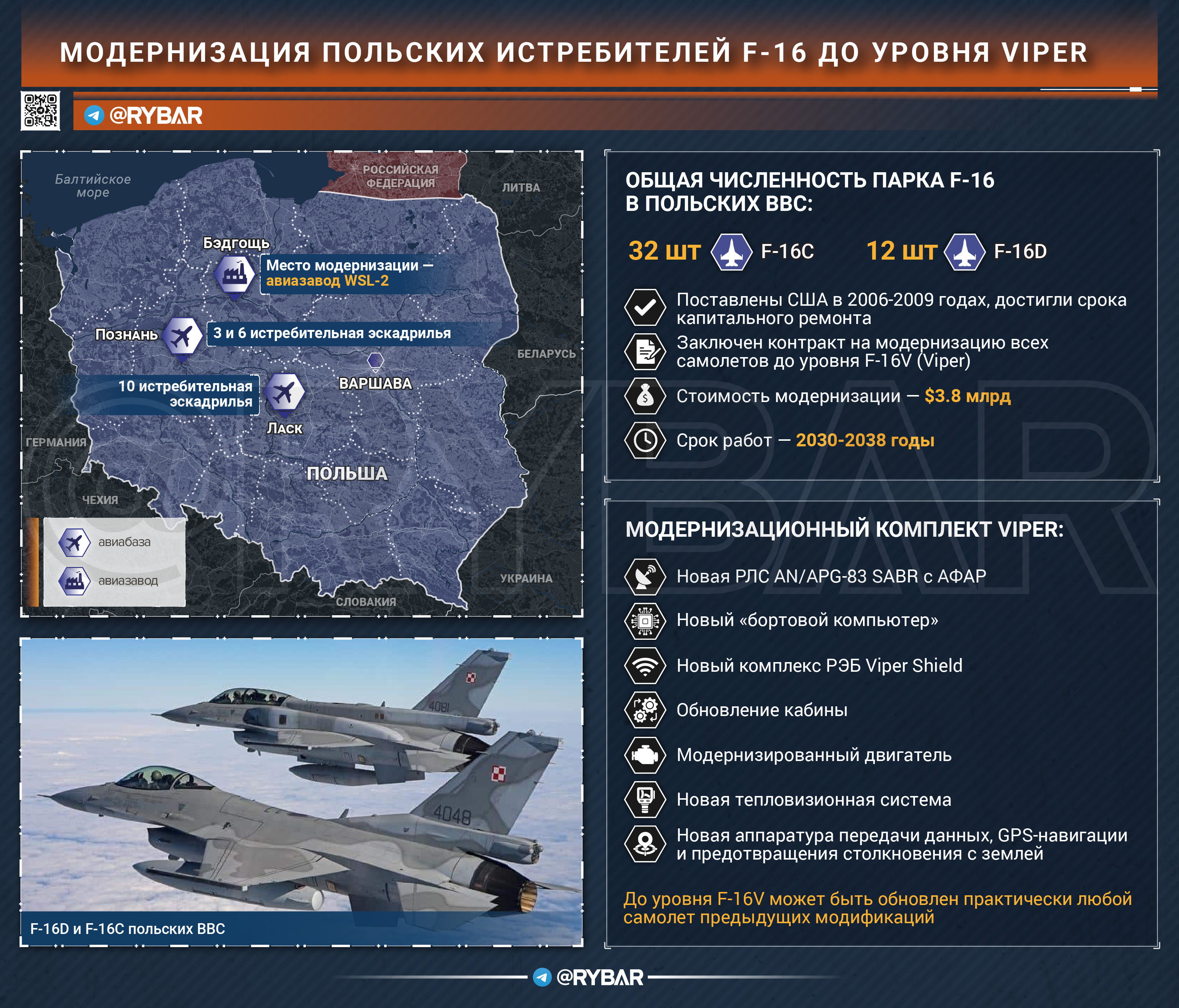 🖍Работы планируются провести в 2030-2038 годах на заводе WSL-2 в Быдгоще, стоимость контракта — $3.8 млрд. В результате ресурс польских F-16 будет продлен на 12 тысяч часов, что позволит оставить их в строю до 2045 года.