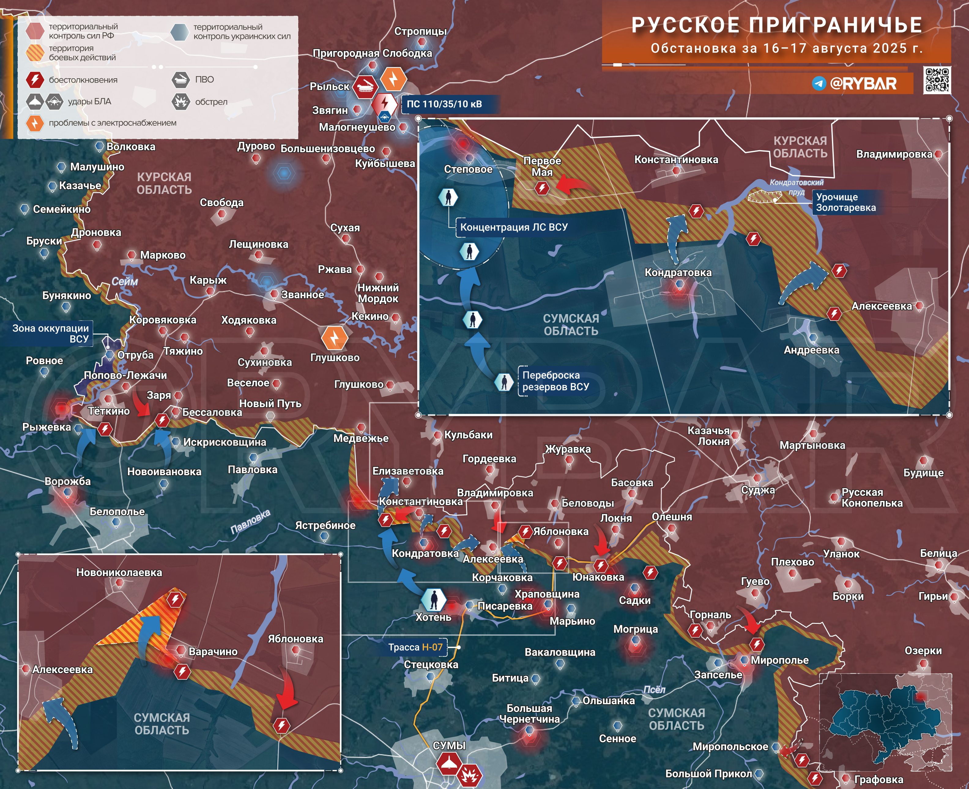 На Сумском направлении ВСУ атакуют у Алексеевки и вклинились у Варачино. БЛА бьют по Курской области: поражены машины на трассах, есть погибшие. Повреждён ПС «Рыльск». Власти призывают не ездить в приграничье.
