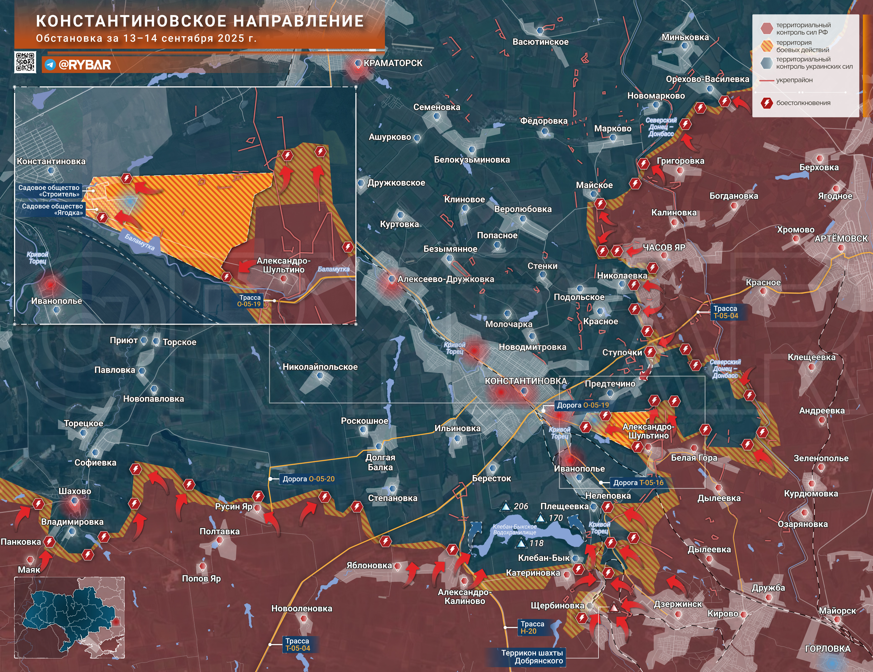 На Константиновском направлении направлении продолжаются бои у Ступочек, а у канала «Северский Донец — Донбасс» ВСУ рискуют попасть в окружение. Южнее российские войска ведут атаки в сторону Константиновки и окрестностях Клебан-Быка.