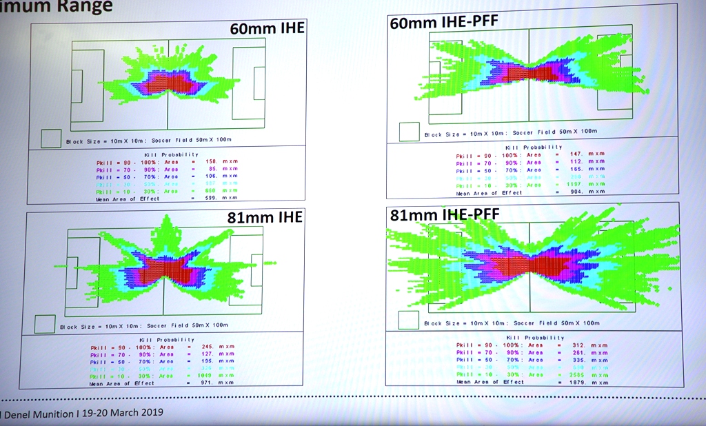 60-мм IHE-PFF, разработанный для Badger, имеет среднюю площадь поражения (MAE), сравнимую со средней площадью поражения (MAE) 81-мм осколочно-фугасного снаряда, причем последний калибр теперь также имеет снаряд IHE-PFF, который, в свою очередь, удваивает MAE по сравнению со старым. Последний также получил большую дальность с использованием 9 зарядов вместо 6-7, использовавшихся в прошлом, и это было продемонстрировано во время ADC2019 при стрельбе на дальность 7 км с максимальной дальностью 7100 метров.