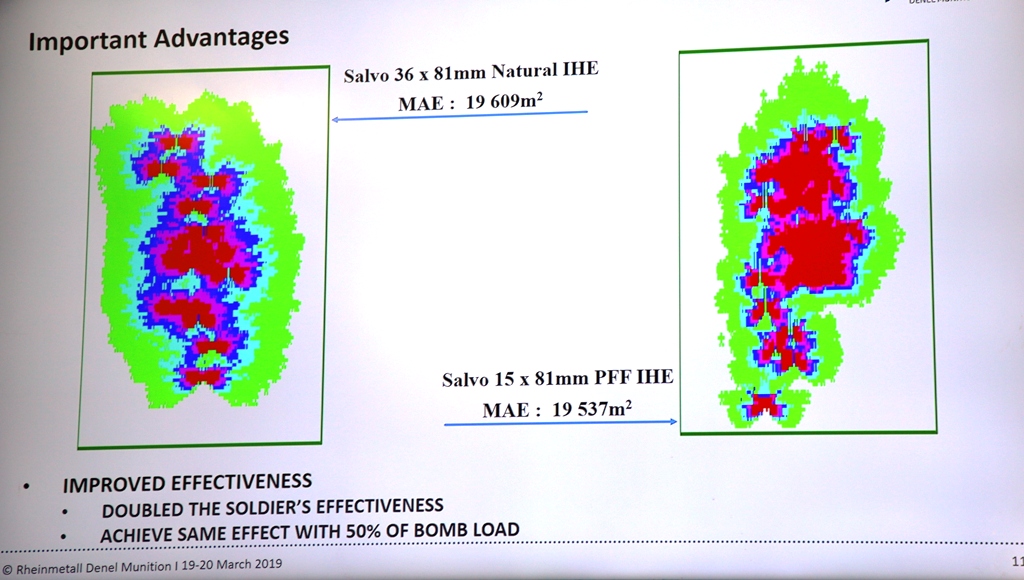 Использование снарядов IHE-PFF значительно снижает логистический след, данные, предоставленные RDM, показывают, что для покрытия MAE в 19 000 м2 подразделение должно выстрелить 35 81-мм снарядами IHE, а при использовании снарядов IHE-PFF это число упадет до 15, т.е. менее чем вдвое, что означает значительную экономию веса и объема, а также живой силы, меньшее количество минометов, способных нейтрализовать цель за то же время, используемое удвоенным вооружением.