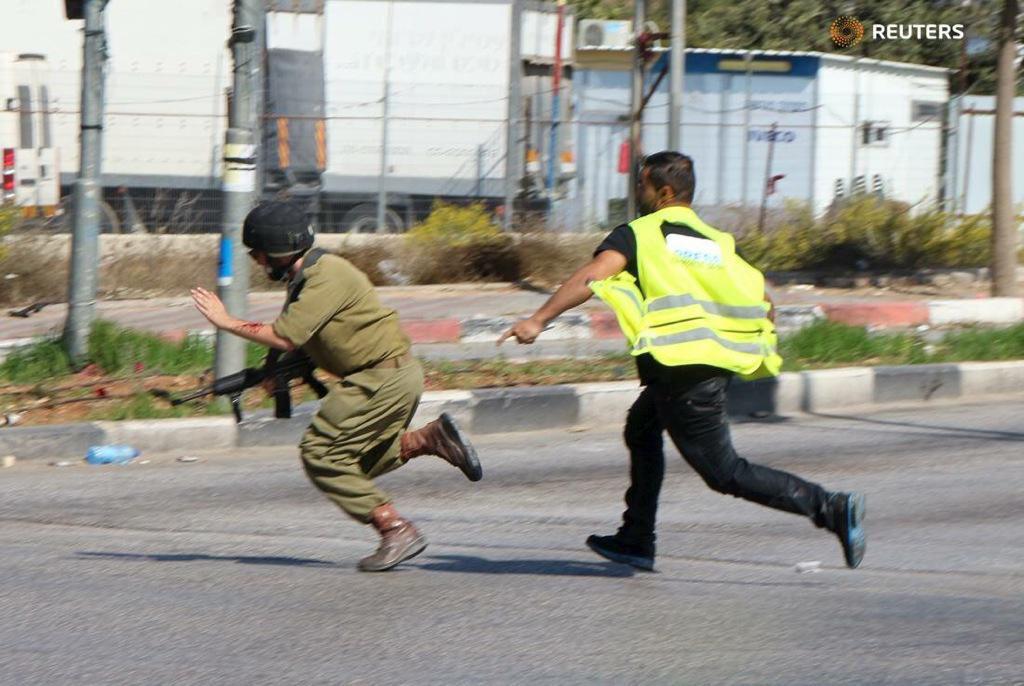 Фотография нападения палестинца на израильского солдата (Палестинец, замаскировавшись под телеоператора, ранил ножом израильского военного на Западном берегу реки Иордан, он уничтожен ответным огнем.) -