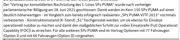 БМП PUMA: в настоящее время заключен контракт на 150 машин для стандарта оборудования VJTF23. Предусмотрено два варианта модернизации еще 77 или 66 машин (т.е. не весь парк из 350 машин). Заказ на вторую партию упоминается как намерение, но никаких новостей.