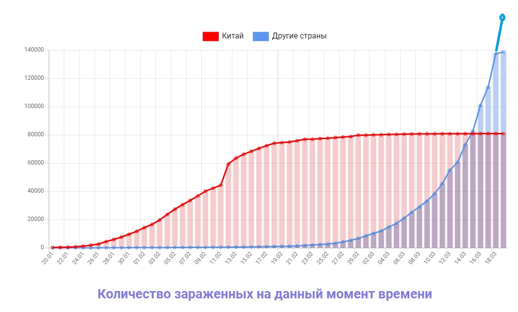 График на сегодня. 16 марта (в этот понедельник) весь мир сравнялся с КНР, сегодня (в четверг) будет очередное достижение - 160 тысяч, ровно в два раза больше инфицированных, чем в КНР. Последнюю точку я дорисовал сам, так как данные за 19 пока неполные и точку на графике за 19 марта можно игнорировать. Пока Европа выдает чистую экспоненту.