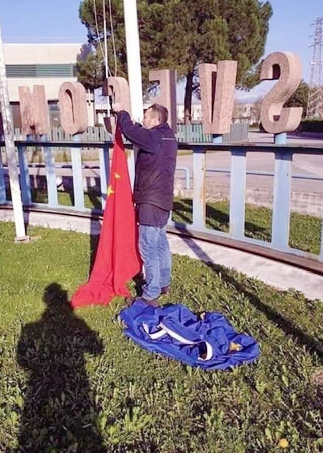Итальянский гражданин спускает флаг ЕС и поднимает флаг Китая.